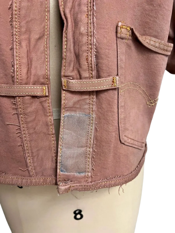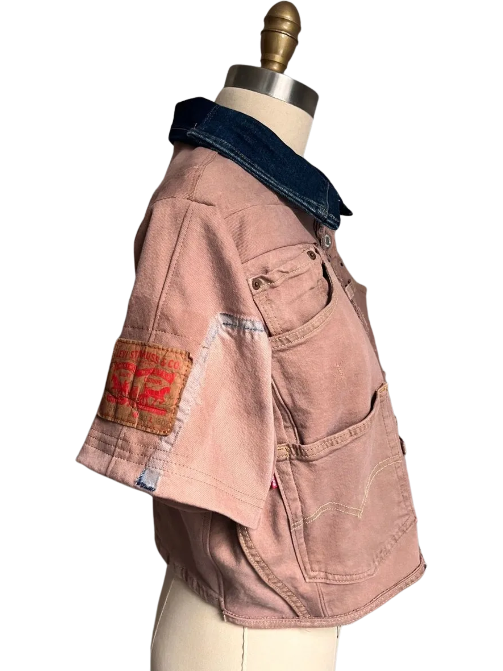 Every original detail has been thoughtfully repurposed, preserving the classic denim fabric, hardware, and construction. All original pockets remain intact for practicality, while the zipper fly has been cleverly reimagined as a functional sleeve pocket. To add a striking contrast, the collar is crafted from blue denim scraps sourced from hemmed jeans.