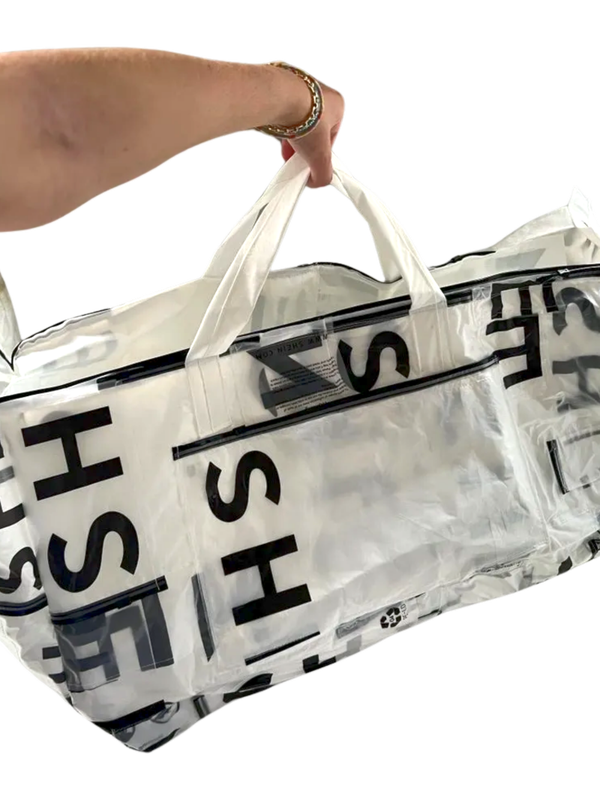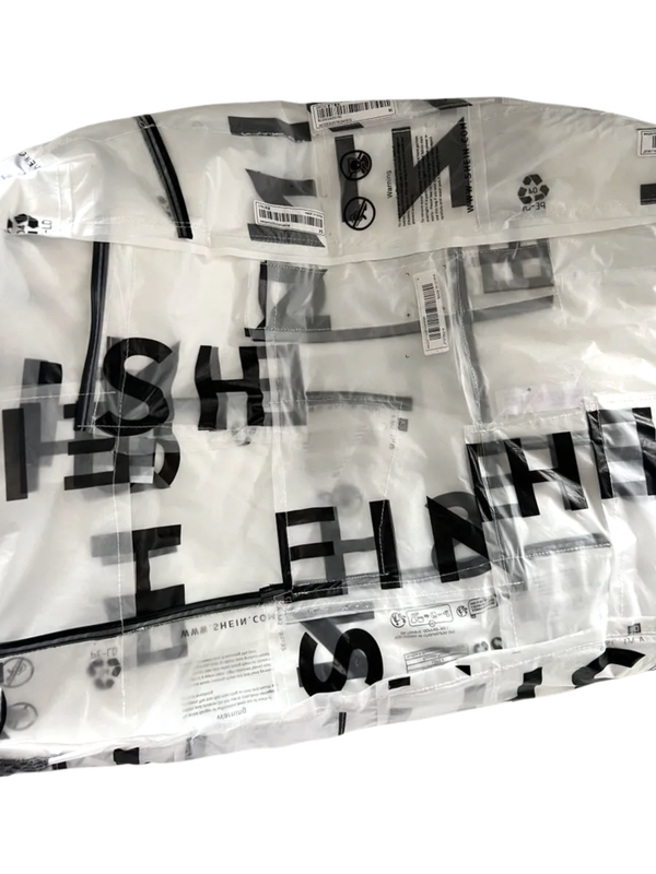 PACKABLE DUFFLE is the ultimate sustainable travel companion for the eco-conscious adventurer. Crafted from over 20 Shein packaging bags and a repurposed shower liner.